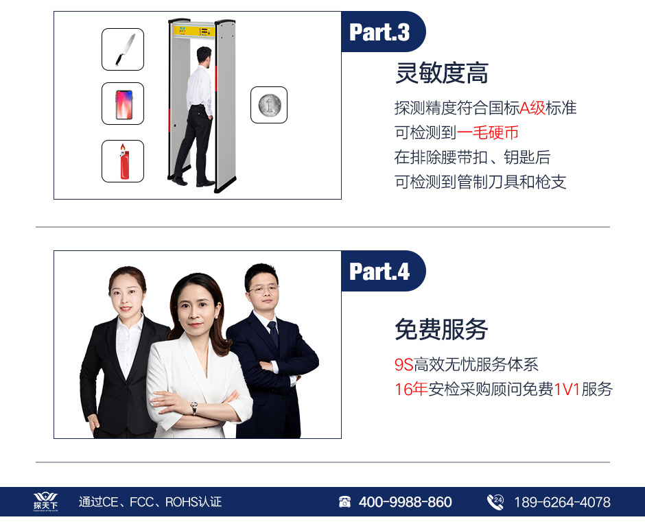 [探測精度]:安檢門高靈敏度可以檢測到一枚鋼質(zhì)壹元錢硬幣,也可以排除皮帶扣、皮鞋、文胸等的影響,檢測到大件金屬或者管制刀具和槍支等違禁物品。